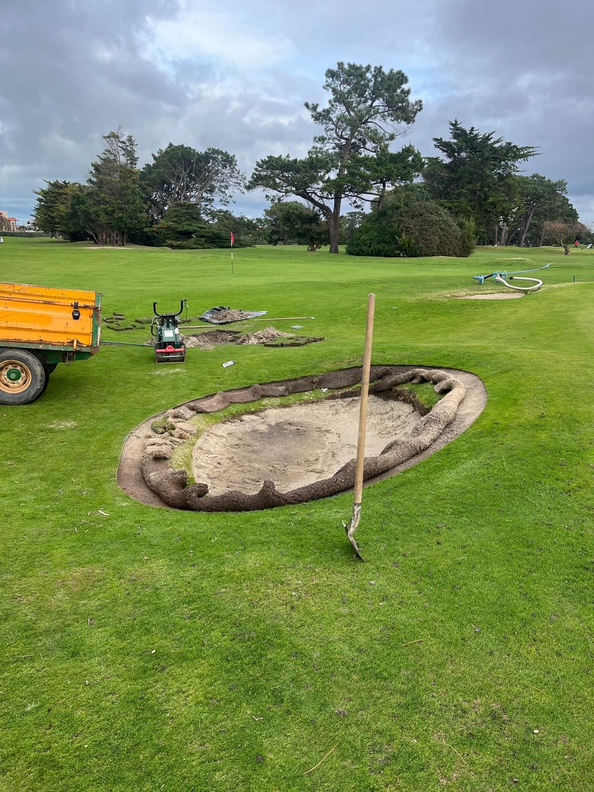 Au cours de cette semaine, une réfection des bunkers de greens des trous n°12, 14, 15 et 18 sera réalisée. Ces interventions ont pour objectif de remodeler les bordures qui se sont affaissées au fil du temps, de contrôler l’efficacité des systèmes de drainage (et de les remplacer si nécessaire), ainsi que de renouveler le sable.